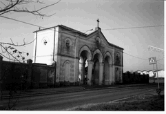 Cimiteri véc : cimitero vecchio (in realtà era il camposanto e apparteneva alla chiesa), ora Via San Giovanni Bosco angolo Via Sempione. Ex Strada del Campo Santo, angolo strada Provinciale del Sempione. Fu inaugurato nel gennaio 1793 e funzionò fino al 1900. Era circondato da un muretto alto circa m. 2,20 (vedi in angolo basso a sinistra) e aveva due finestre con delle inferriate ed ai piedi un gradino genuflessorio in pietra. Entrando a destra c’era la casetta mortuaria che fu demolita nel maggio 1905, pur rimanendovi ancora alcune tombe con lapidi.. Quando hanno esumato le salme dei nostri vecchi, una Casoratese che abitava lì di fronte si ricorda che è venuta fuori una bara contenente la salma di un prete, era intatta con la sua tonaca nera! Ovviamente, al contatto con l’aria, si è ridotta subito in polvere. Ora c’è il campo di pallacanestro. Nella foto si nota: in basso a sinistra il muretto (oggi non più esistente) del vecchio Cimitero, la scala che porta alla chiesa (ora ristrutturata) e la stradina che collegava il vecchio cimitero alla chiesa, si chiamava Strada del Camposanto e della Chiesa (nel 1865), partiva dalla Postale (cosi era definito l’attuale Sempione), “da tramontana” e verso “ponente” terminava alla Chiesa.