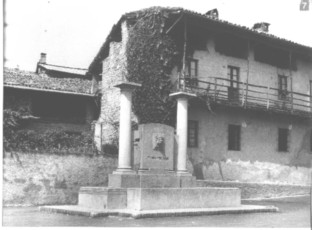 Foto alto destra a destra (del signor Luigi P.) la fontana appena costruita, si intravede la scritta fascista: ANNO XII E. F. (Era Fascista); seduto in centro il signor Luigi siamo nell'anno 1933. In basso a sinistra la fontana senza la scritta fascista; in basso a destra l'aspetto attuale del caseggiato.