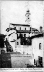 Piazál da la géþa : (piazzale della chiesa). Nella prima foto: (per gentile concessione della sig. Lilla Rotolo) in primo piano tre modelle della ditta Reiser & Cattoretti, lo stabilimento era quello di via Milano (aperto nel 1863), rilevato poi da Manifatture Cozzi, da notare il timbro originale della ditta, rinomata in tutta Italia e all’estero fin dal lontano1863 per i suoi pizzi "Sangallo" di pregevole valore. Da osservare le loro camicette tutte di pizzo e le coccarde sul vestito, al centro “la colonna di S. Carlo” (si dice che fu voluta da S. Carlo per scacciare la peste), rimossa e inglobata nell’ampliamento della chiesa nel 1925/26. Nella seconda foto: (archivio prof. Parolo) la chiesa prima dell'ampliamento e la colonna in primo piano; in sua sostituzione venne posato un monumento ai Caduti, a destra in basso si vede la prima delle 14 edicole delle stazioni della Via Crucis. Nella terza foto (per gentile concessione del signor P. Luigi Milani), il monumento ai caduti della guerra 1915\1918. Nella quarta foto sotto con la scritta in calce del nostro compianto Don Luigi Mariani, scattata appena terminato l'ampliamento della chiesa il 15 aprile 1926 si notano: La croce del campanile in origine ed ora sostituita con l'attuale. Un solo orologio del campanile, ora sono quattro. Il monumento ai caduti della prima guerra mondiale 1915-1918 con i nomi dei casoratesi (vedi foto tre) caduti nella guerra. I pinetti piantati in occasione della posa del monumento con la targhetta in ottone sostenuta con un paletto di legno (un pinetto ogni caduto) con i nomi delle generalità di ognuno. Un particolare che non mi è sfuggito, non meno importante ma che rappresenta la "circolazione" a quei tempi, sono le tre striscie parallele che si notano nella quarta foto in basso a sinistra, sono tre sentieri, i due laterali sono quelli lasciati dalle ruote dei carri (quelli trascinati dai cavalli), quello centrale è quello lasciato dal cavallo che trainava il carro. A quell'epoca e fino al 1960 circa, le strade periferiche di Casorate Sempione erano carrareccie, noi le chiamavamo "carengiàn" (vedi voce in MEMORIA STORICA DI CASORATE SEMPIONE\Vocabolario Casoratese\C\"carengiàn".