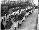 Nella foto di destra, gentilmente concessa dalla famiglia Chiaravalle, in primo piano i ragazzi (lüižģt) seguiti dalla scuola degli uomini (schra di óm).