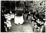Foto di sinistra, in primo piano la curiéra con attorno i bambini degli asili di allora con la divisa che li contraddistingueva, a sinistra il grembiule tassativamente azzurro dei Paulģtt a destra grembiule bianco dei Civąsch. Allestrema destra lasilo dei Civąsch.